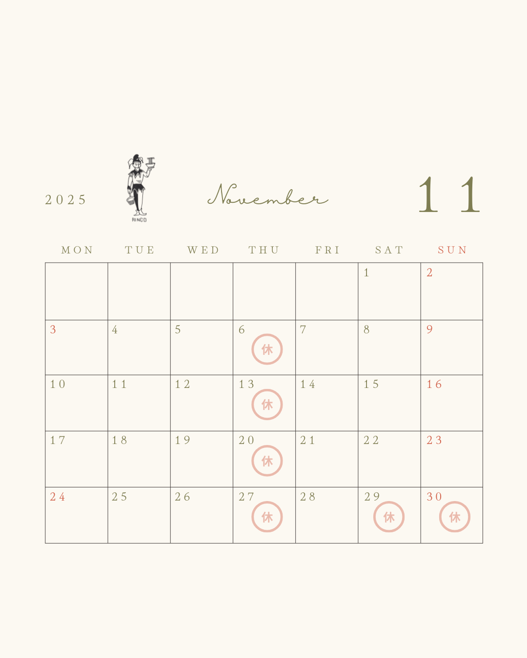定休日の他に、29日(土)・30日(日)はお休みをいただきます。