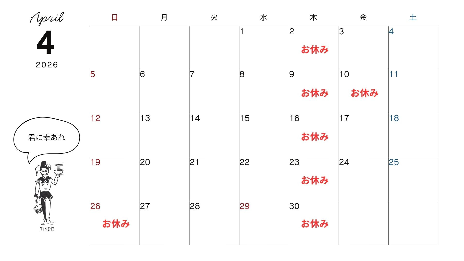 4月の営業日のお知らせ